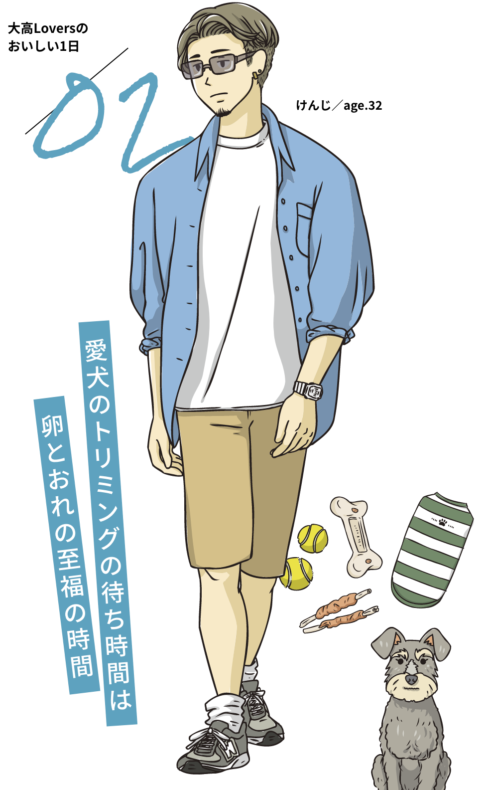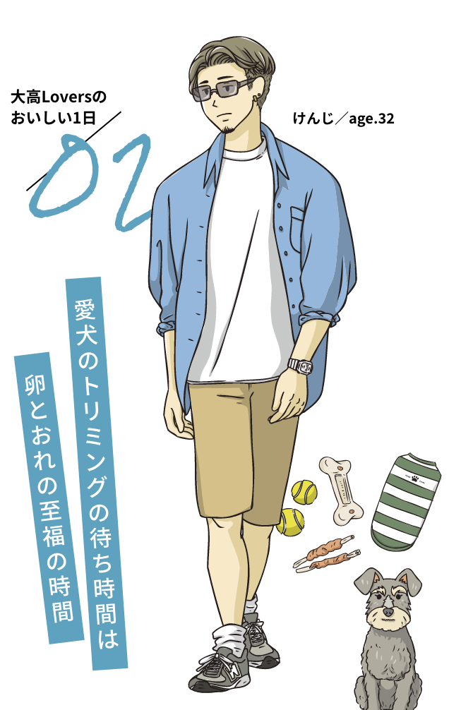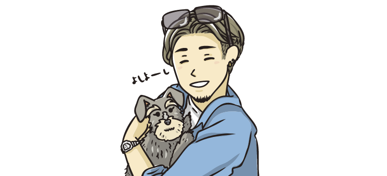 彼女にフラれたのがきっかけで飼い始めたミニチュアシュナウザーの「ムギ」を溺愛。強そうに見えて実は繊細。